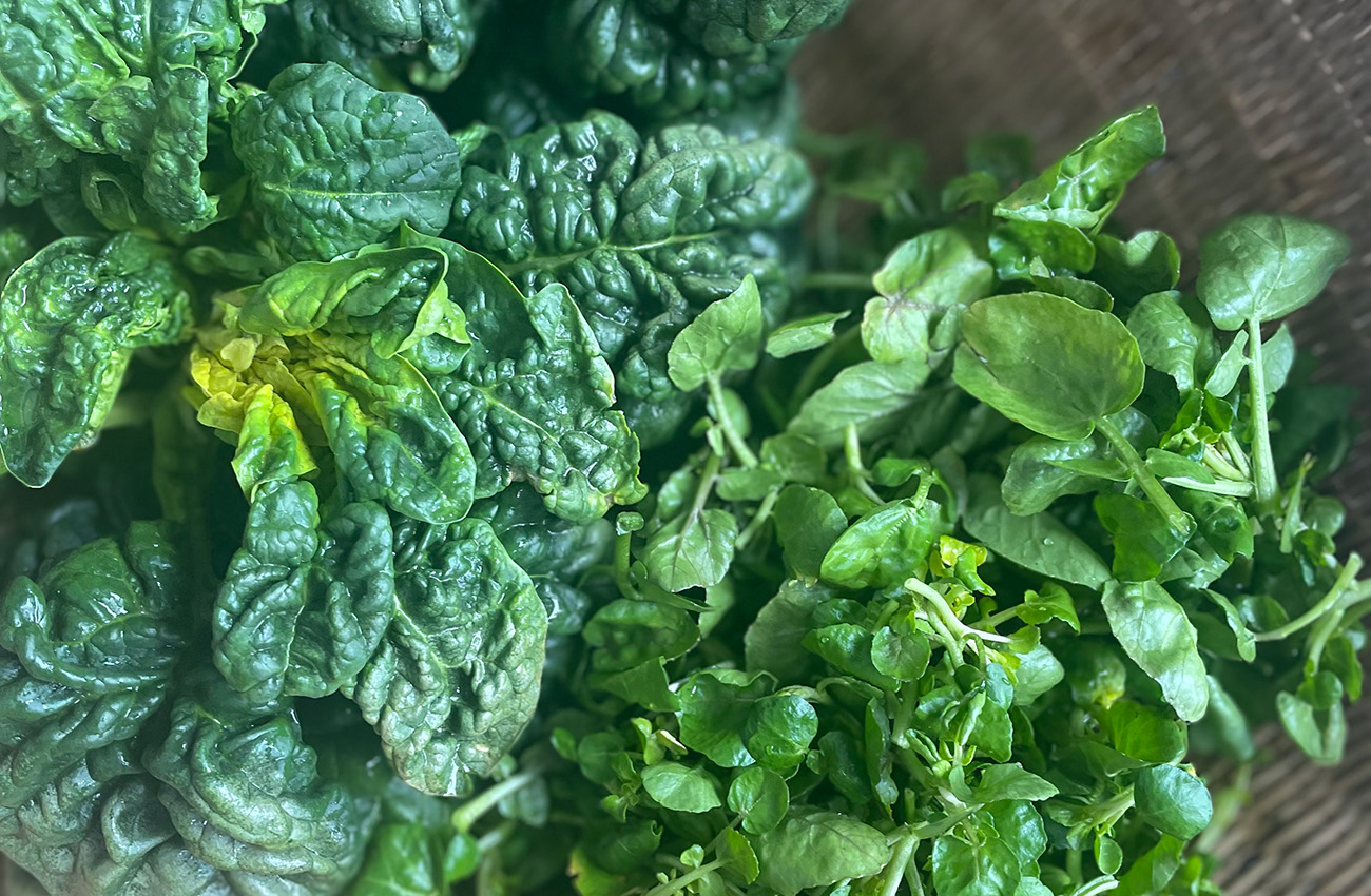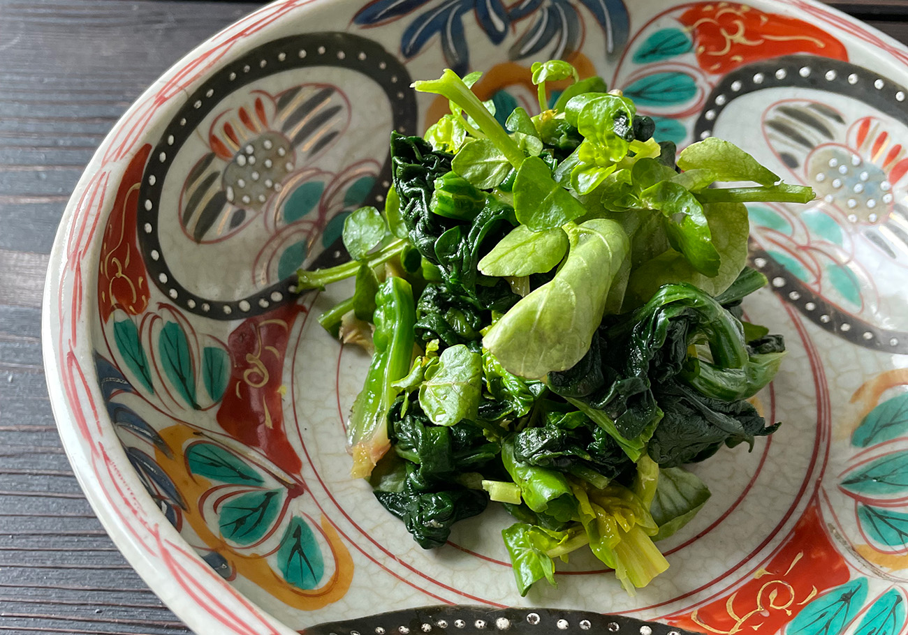 去年漬けた味噌に溜まった「みそたまり」と「イタヤカエデのシロップ」、雪解け水の川に生い茂っていた早春の「クレソン」、魚沼に春の訪れを告げる「大崎菜」を使った一品です。