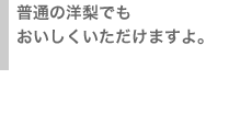 私が初めて洋梨というものを食べたのは、かれこれ20年ほど前。フランスのマルシェで山積みされた、黄緑色の、ひょうたんみたいな「ポワール」。食べたことのない独特の風味に、しばしうっとりしたものです。さらに洋梨はそのまま食べるだけでなく、焼いたり、コンポートにしたりと、デザートにも使え、日本で食べなれた和梨ではありえないこと。私はこの“ヨーロッパっぽい”フルーツが好きになり、帰国してからも季節になるといろいろな調理法で楽しんでおりました。それが、新潟に来て初めてルレクチエに出会ってからというもの、今までの洋梨レシピがまた一段とおいしくなり、それはそれは感動! とろんと熟したルレクチエの皮を、ナイフで薄くむき、透明感のあるクリーム色の果肉をいただく。幸せのひと時・・。このままでも充分デザートになるのですが、火を通すとまたいっそう香りが立って美味。なので私は毎年、最初は冷たくしたものを、今年の出来を確かめながら大事に食べる。そしてその次に、焼き菓子にしたりアレンジを加えて贅沢にいただくのです。ルレクチエはもともとフランスのフルーツで、その種を新潟に持ってきて栽培を始めたということ。秋ごろまだ青い果実を収穫し、後は11月の終わり頃まで貯蔵庫で大切に追熟させます。大事なのは食べごろを上手に見分けること。色はレモンをもう少しクリーム色にさせた感じ。おしりの匂いをくんくんとかいで、甘〜い香りがしてきたらOK。 |